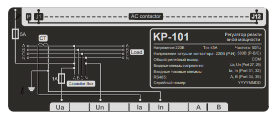 Номинальное напряжение питающей сети для КР-101 составляет 220В или 380В переменного тока. Следовательно, может применяться для компенсации реактивной мощности в однофазной или трехфазной сети.