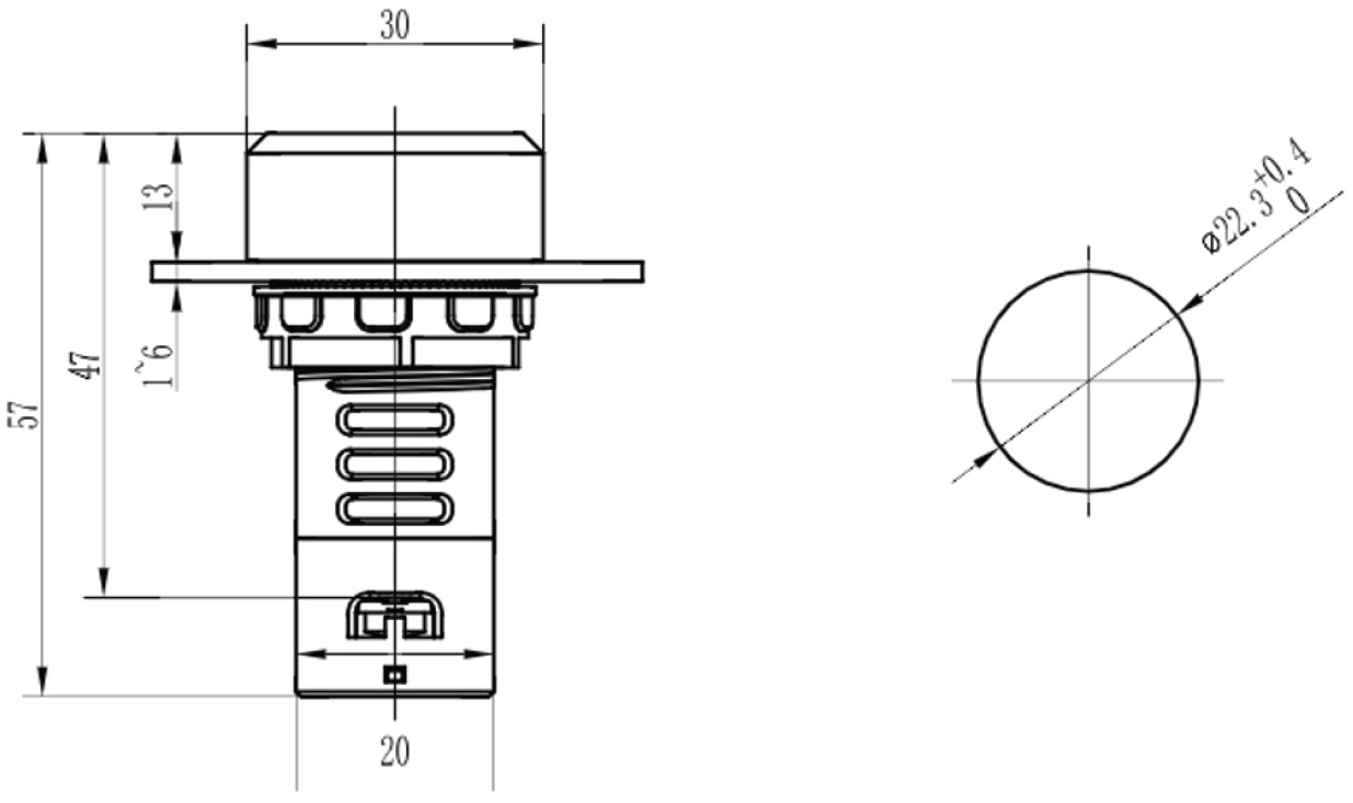 | Установочный диаметр, мм | 22,5, 22,3 +0,4/0 в соотв. с ГОСТ IEC 60947-5-1 |
