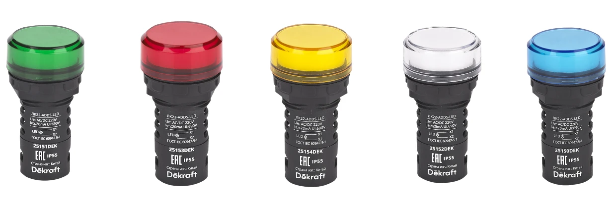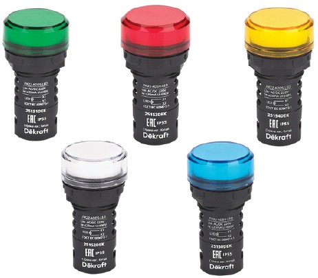 Лампы коммутационные Dekraft серии ЛК-22 IP55 предназначены для индикации состояния электрических цепей. Применяются в электрических цепях постоянного и переменного тока частотой 50/60 Гц с номинальным рабочим напряжением 12В AC/DC, 24В AC/DC, 110В AC/DC, 220В AC/DC или 220В AC, 380В AC.