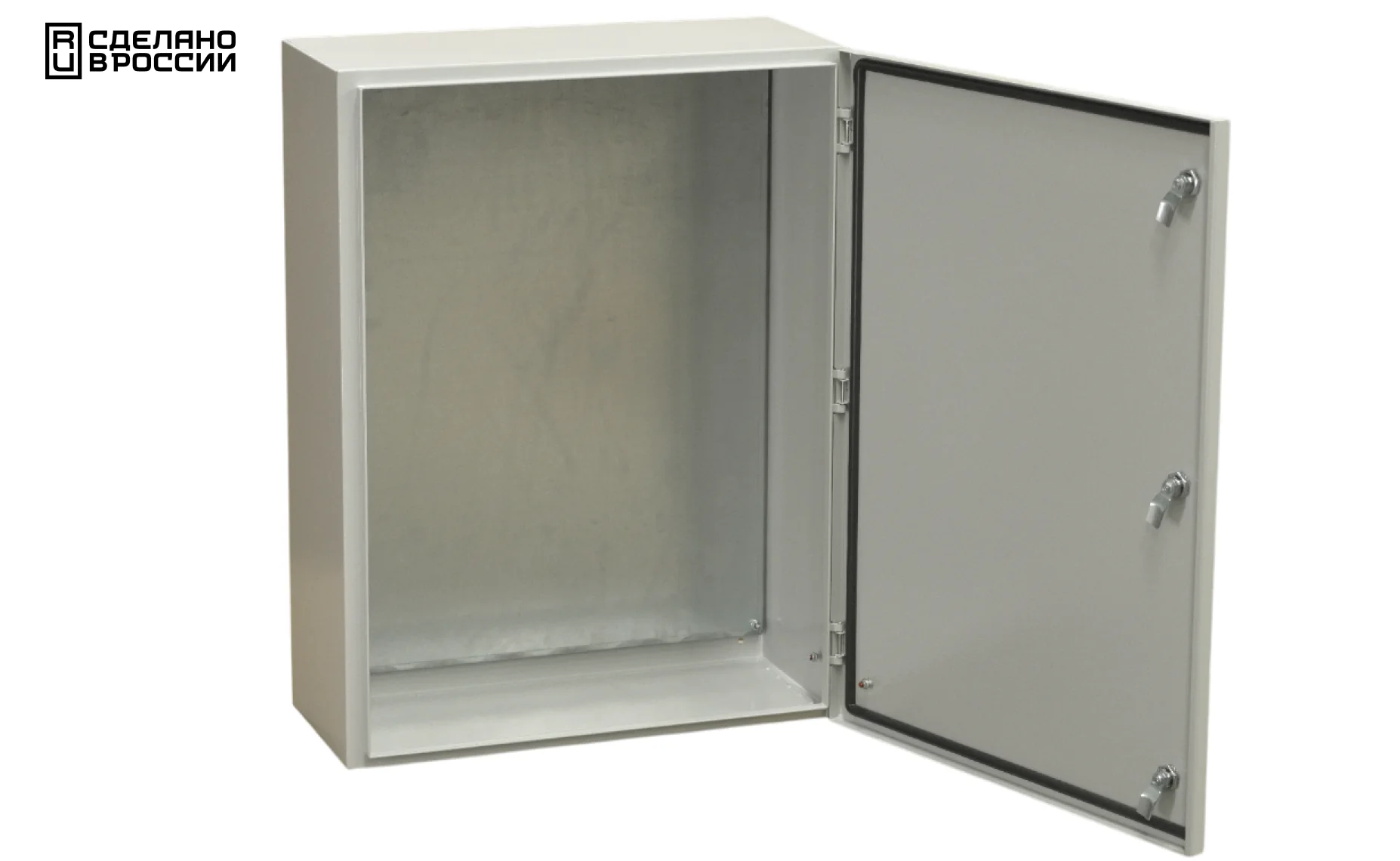 Двойной гиб на корпусе обеспечивает лучшее прилегание уплотнителей, увеличивая их срок службы и повышая герметичность конструкции. Дополнительная отбортовка двери повышает ее жесткость в области замков, делая дверь более устойчивой к механическим воздействиям. Приварные шпильки обеспечивают прочную фиксацию монтажной панели внутри корпуса, исключая возможность её случайного сдвига. Отбортовка монтажной панели улучшает её устойчивость к деформациям при монтаже и эксплуатации. Замки покрыты оцинкованным покрытием, защищающим их от коррозии и продлевающим срок службы. Угол открытия двери стал больше благодаря дополнительному вырезу на двери под петлей, что облегчает доступ к внутреннему пространству шкафа.