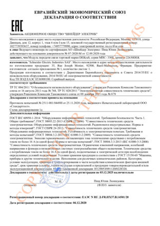 Декларация о соответствии требованиям Технического регламента Таможенного союза ТР ТС 020/2011 "Электромагнитная совместимость технических средств", Декларация о соответствии требованиям Технического регламента Таможенного союза ТР ТС 004/2011 "О безопасности низковольтного оборудования"