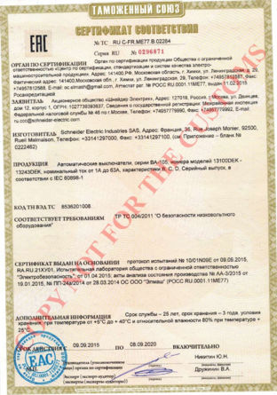 Сертификат соответствия требованиям Технического регламента Таможенного союза ТР ТС 004/2011 "О безопасности низковольтного оборудования"