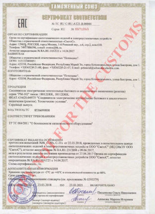 Сертификат соответствия требованиям Технического регламента Таможенного союза ТР ТС 004/2011 "О безопасности низковольтного оборудования"