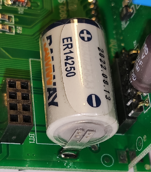 В старших моделях МТ-96D с функцией мультитариф ( МТ-96D THD MT, заказные номера 51508DEK ... 51515DEK) имеется литиевая батарейка для поддержания хода встроенных часов точного времени. Батарейка несменяемая, (контакты приварены к батарейке точечной сваркой и припаяны к плате прибора). Тип батарейки: ER14250. См. приложенное фото
