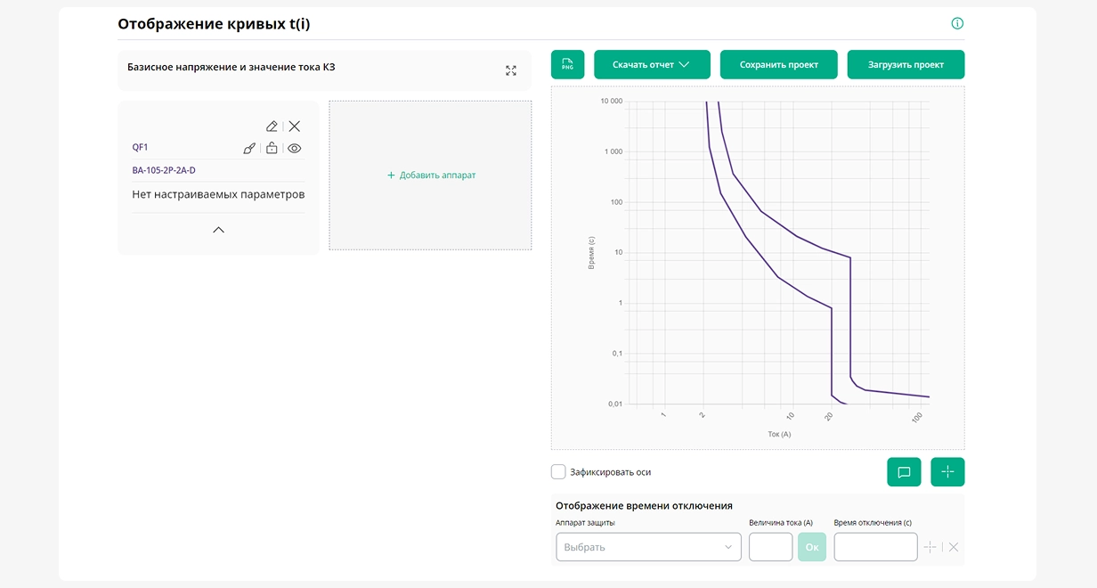 Инструмент позволяет отобразить время-токовые характеристики аппаратов защиты на одном графике. Вы можете скорректировать график с помощью настройки уставок оборудования в пределах допустимых значений.