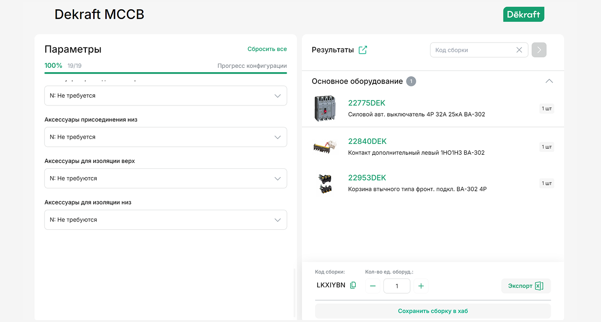 Инструмент позволяет выбрать по параметрам необходимый автоматический выключатель в литом корпусе на токи от 16 до 1600А, а также подобрать к нему все необходимые совместимые аксессуары.